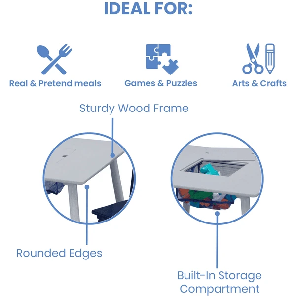consta de una robusta mesa con almacenaje en el centro y dos sillas a juego.