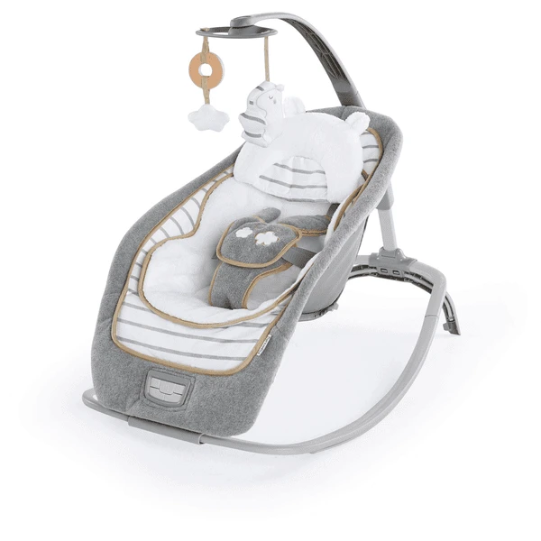 Este sillón reclinable modern e ofrece una opción única de respaldo con tres posiciones muy diferentes para que su bebé esté lo más cómodo posible. Este asiento se balancea pero también puede convertirse en un asiento fijo con vibraciones relajantes, sonidos de la naturaleza y música. La barra de juguetes se puede retirar para que el asiento se convierta en una práctica mecedora a medida que el bebé crece.