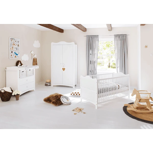 La serie’Florentina’ está disponible en ocho habitaciones para niños y dos variantes de ahorro. El práctico accesorio de estantería puede adquirirse directamente o añadirse posteriormente como un único artículo para disponer de suficiente espacio de almacenamiento en la estación de cambio de pañales. Además, el envío incluye tres colores de pomos para los muebles: blanco, rosa y menta.