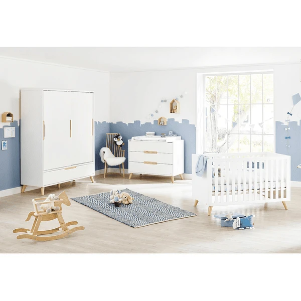 Habitación infantil en tres partes, compuesta por una cuna con marco de rejilla y laterales de conversión, un amplio cofre cambiador con cambiador y un gran armario con puertas correderas, 5 estantes parcialmente ajustables en altura y 1 barra de colgar ropa.