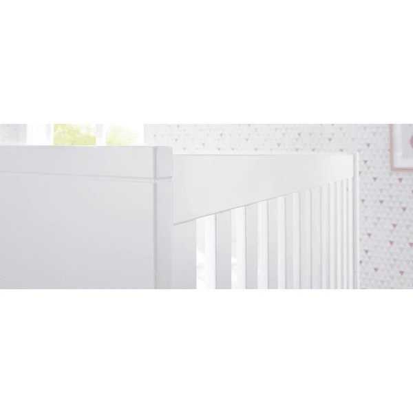 Habitación infantil de 3 piezas compuesta por una cuna con somier y laterales de rejilla, amplio cambiador con cambiador y gran armario con 6 estantes regulables en altura y 1 barra de colgar ropa.