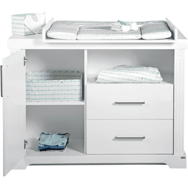 El cambiador roba con tapa cambiadora es un verdadero todoterreno y le servirá durante muchos años. El cambiador estable se puede utilizar como asiento elevado para su hijo de jardín de infancia, para que pueda ayudarle fácilmente a vestirse en una posición cómoda de pie. Más adelante, el mueble cambiador puede utilizarse como cómoda en el salón o en el cuarto de los niños.