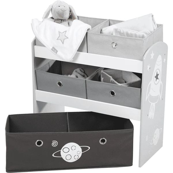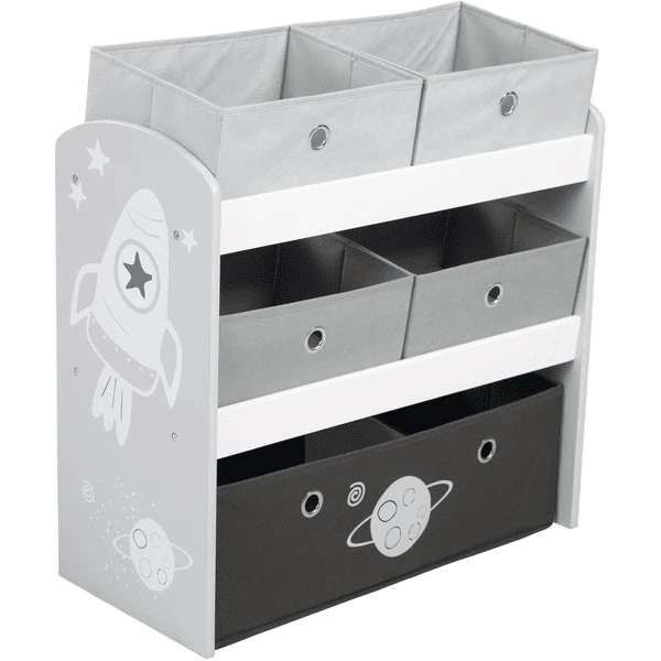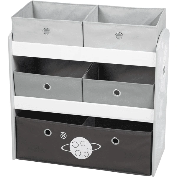 Con la estantería de juegos, hasta los niños más pequeños aprenden a mantener el orden en la habitación de los niños. Gracias a los grandes Metal ojales del mango en L, las cajas de tela pueden ser fácilmente removidas y puestas de nuevo en el estante de juguetes. La caja de tela más baja y más grande está impresa en los lados de la estantería para que coincida con el motivo de la impresión. Con 5 cajas de tela.