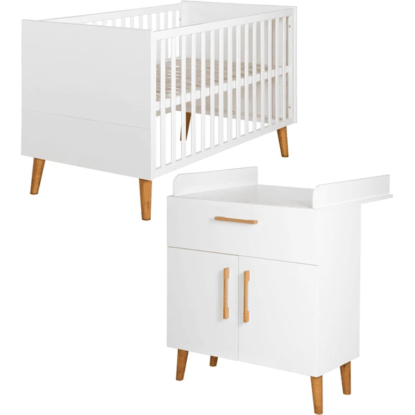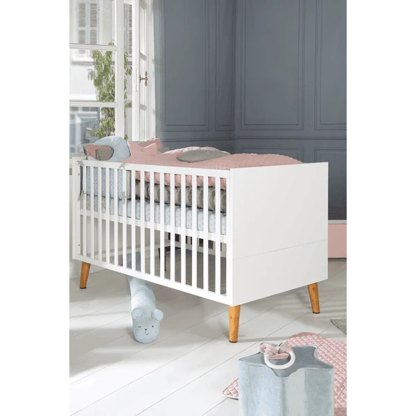 La cuna puede convertirse en una Junior cama con lados de conversión disponibles por separado. Por lo tanto, se puede utilizar hasta los 7 años de edad (o un peso de 50 kg). Especialmente cómoda para levantar a su bebé de la cama es la posición superior de la cuna de triple altura ajustable. Los 3 peldaños desmontables permiten a su hijo entrar y salir con seguridad. La cuna cumple con las normas de seguridad actuales según EN 716 – 1:2017 + AC:2019. El cambiador de pañales con accesorio para el cambio de pañales hace que el cuidado del bebé sea un placer para los padres y el bebé con su cómoda altura de cambio de pañales de 93,5 cm. Sin la unidad de cambio de pañales, la mesa de cambio sirve como cómoda. La unidad de cambio de pañales cumple con las normas de seguridad actuales según EN 12221 – 1+2:2008 + A1:2013.