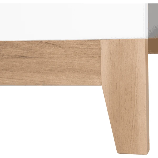 La posición de tumbado superior de la cuna de altura regulable en 3 posiciones es especialmente cómoda para la espalda de los padres. Puedes levantar fácilmente a tu bebé de la cuna desde esta altura de tumbado. Más adelante, la posición intermedia es la opción perfecta, ya que las 3 barras deslizantes extraíbles del elemento de la cuna permiten a su hijo pequeño entrar y salir con seguridad. La posición más baja de la cuna ajustable en altura está destinada a la cama Junior . Cuando su bebé sea mayor, la cuna combinada puede convertirse en una cama Junior utilizando los laterales de conversión que están disponibles por separado. El cabecero y el piecero de la cuna combinada pueden dividirse. Cuando se convierte en una cama Junior , se utilizan las dos mitades superiores del cabecero y el piecero y se crea un nuevo aspecto en la habitación infantil.